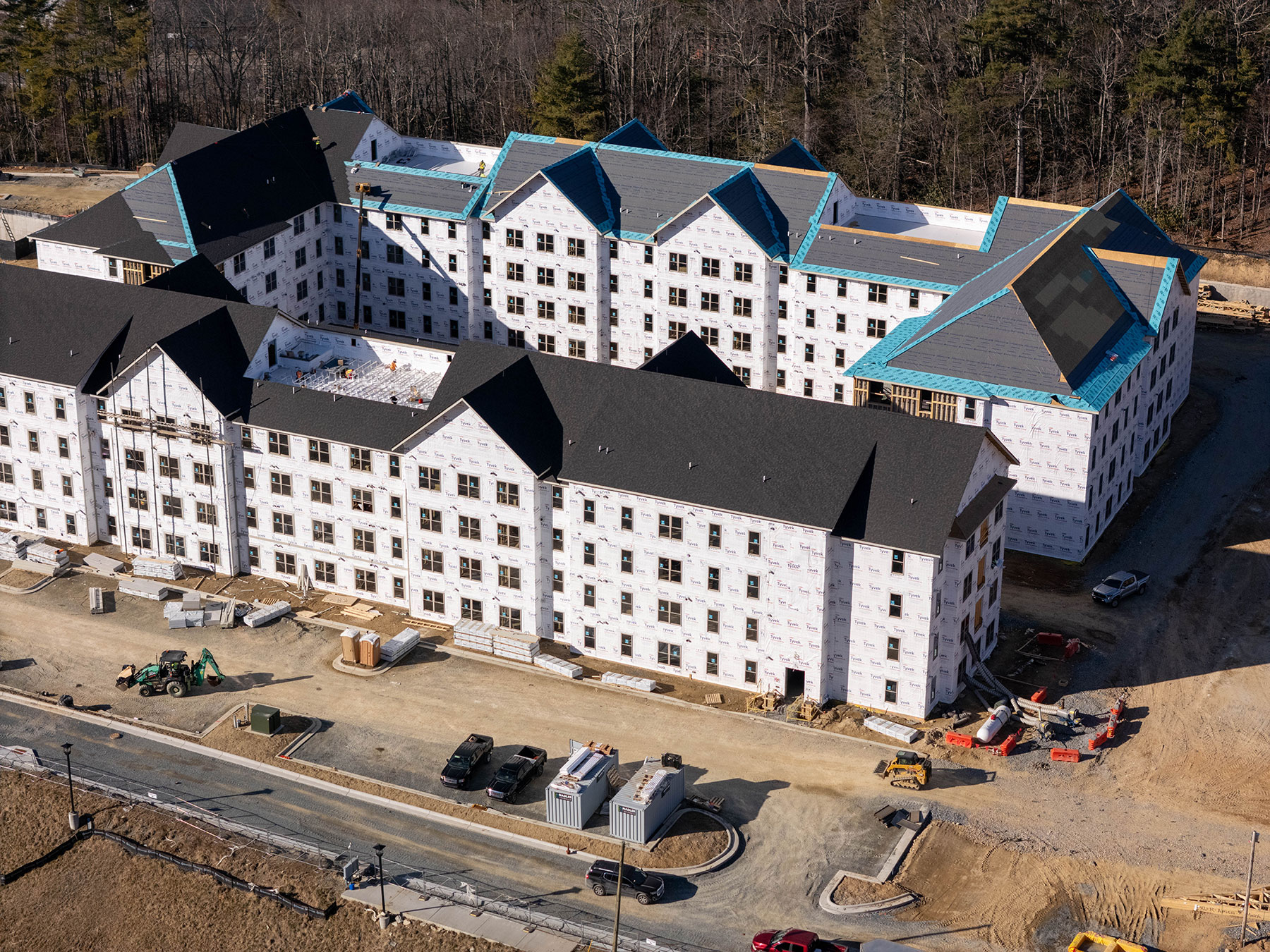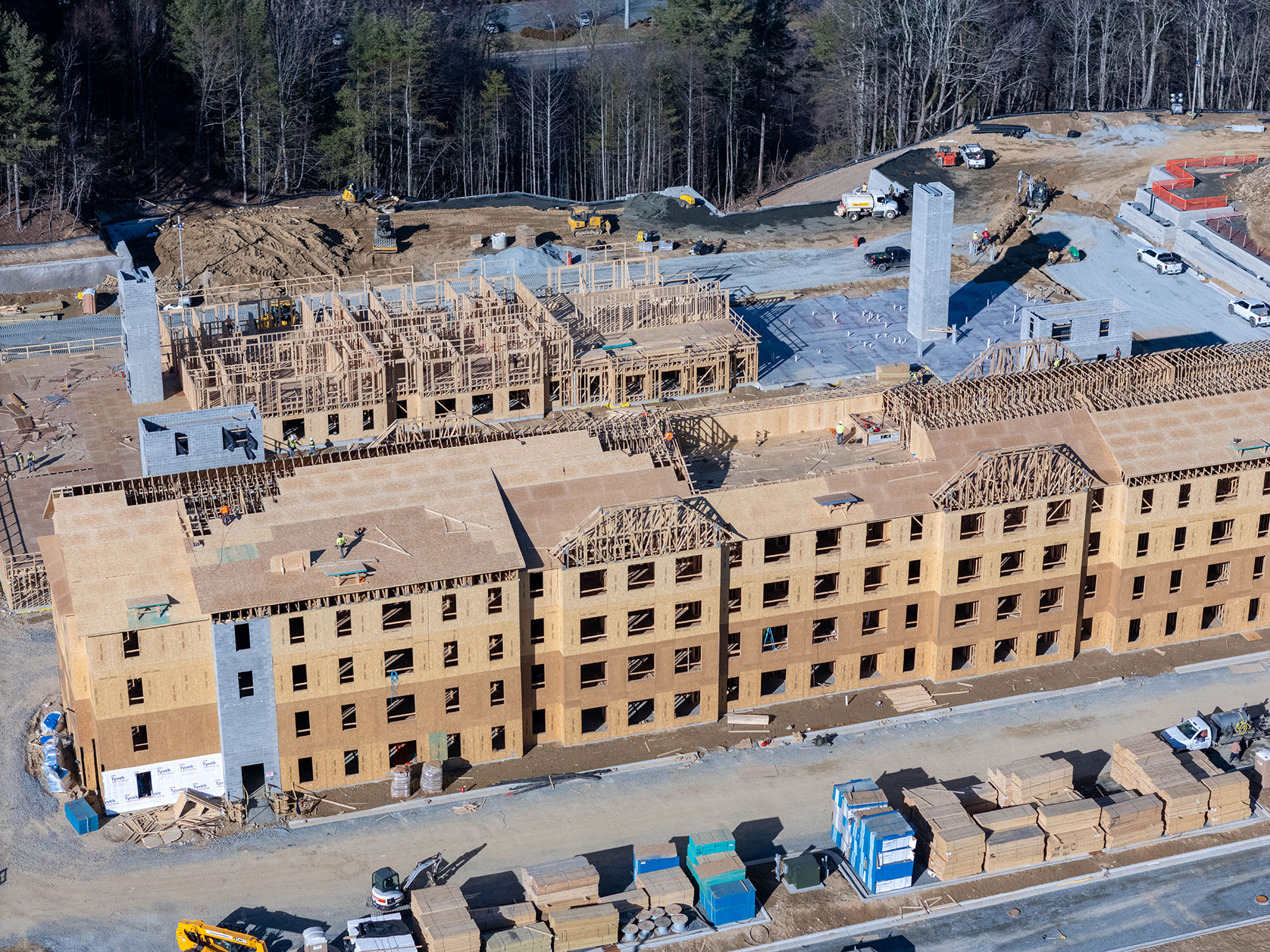 Site preparation for the construction of the project began in May 2025, and construction is expected to be completed by fall 2027. Site demolition and erosion control were completed in summer 2025 and the project is more than 30% completed, as of February 2026. Ongoing construction for the project includes framing and sheathing, window and roof installation, and mechanical, electrical and plumbing rough-ins. Additionally, crews are preparing the site for upcoming foundation work for the complex’s clubhouse.