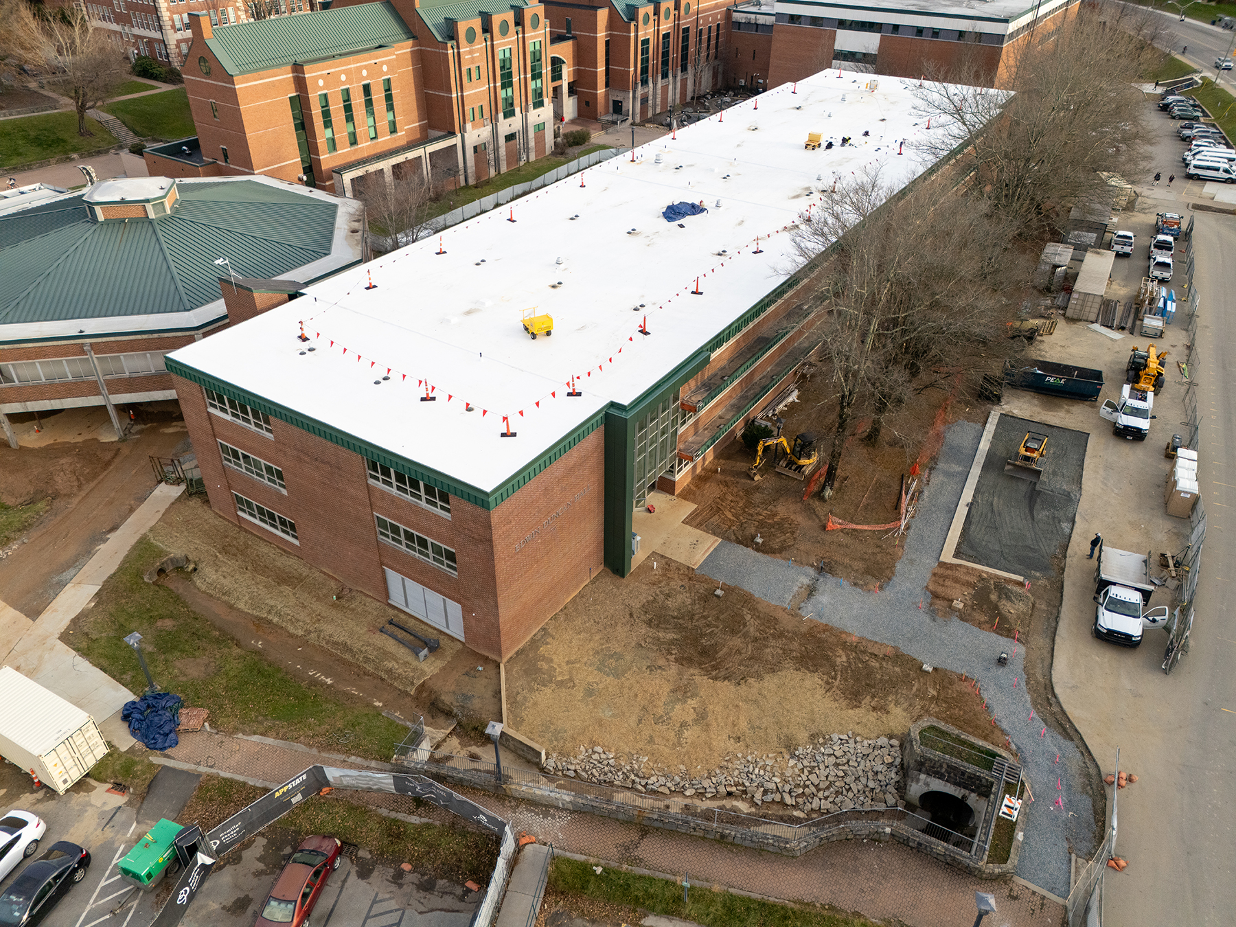 Preparation work for the Edwin Duncan Hall renovation began in June 2023 and construction is underway, having begun in late December 2023. The project experienced a 45-day schedule setback due to Hurricane Helene, which hit the Boone area on Sept. 27, 2024, and is 80% complete as of November 2025. The Edwin Duncan Hall project is slated for completion in spring 2026.