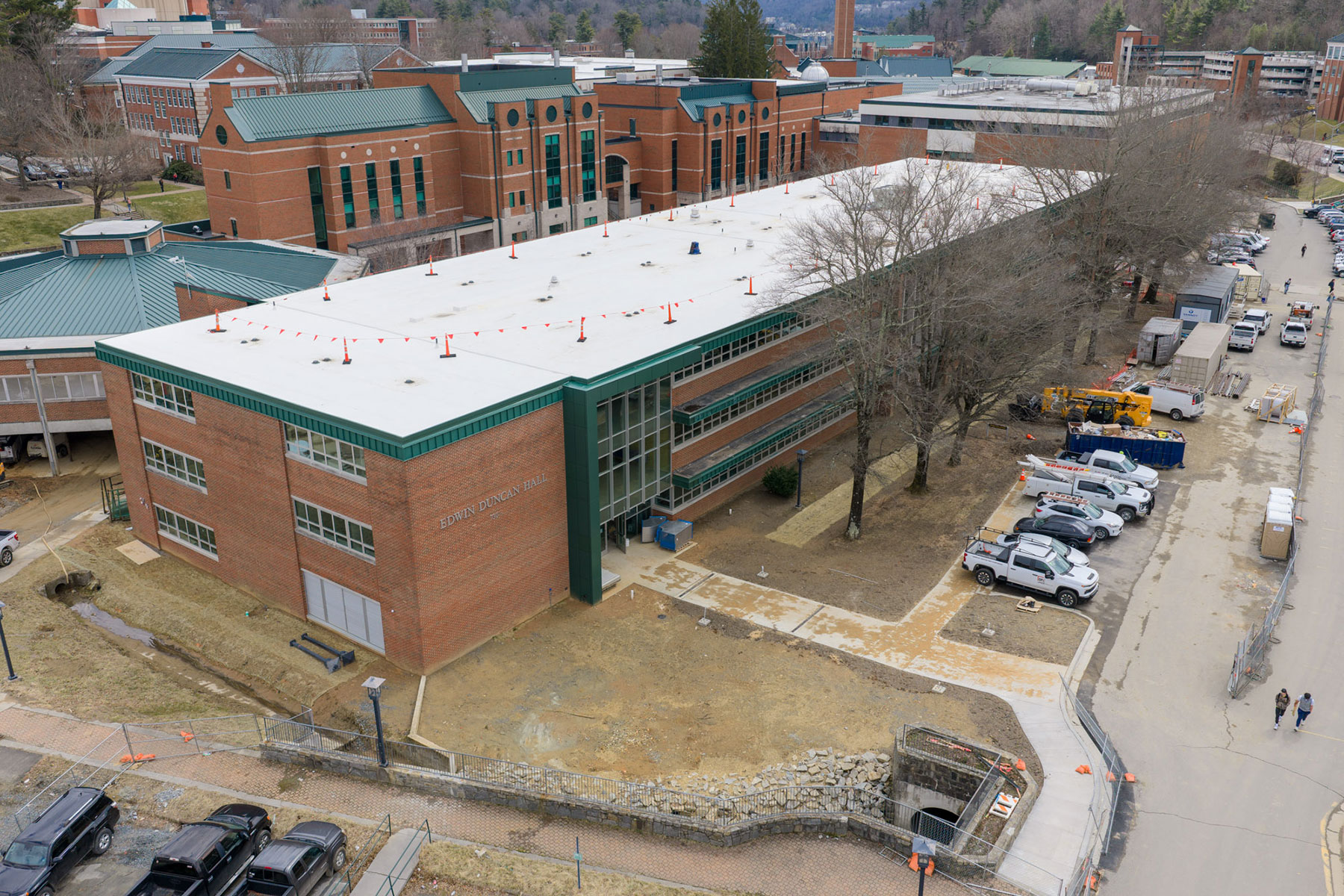 Preparation work for the Edwin Duncan Hall renovation began in June 2023 and construction is underway, having begun in late December 2023. The project experienced a 45-day schedule setback due to Hurricane Helene, which hit the Boone area on Sept. 27, 2024, and is nearly 85% finished as of February 2026. The Edwin Duncan Hall project is slated for completion in spring 2026.
