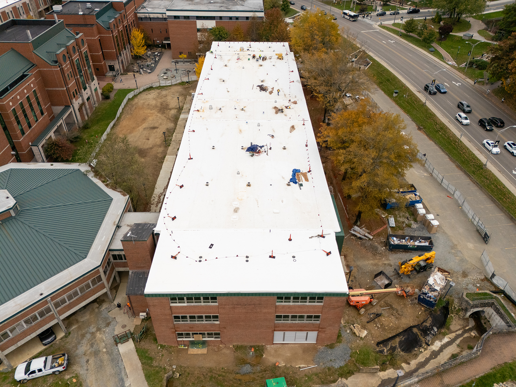 Recent construction work for the project includes installing framing lab spaces on the third floor, hanging and finishing drywall, hanging lights, painting interior spaces and performing electrical work for the building’s elevator system. Additionally, workers are nearly finished with the roofing work for the facility and are preparing to install sod near the side of the building that faces Rankin Science North. Edwin Duncan Hall’s main entrance has been shifted to the northwest end of the building, near the adjacent Peacock Parking Lot.