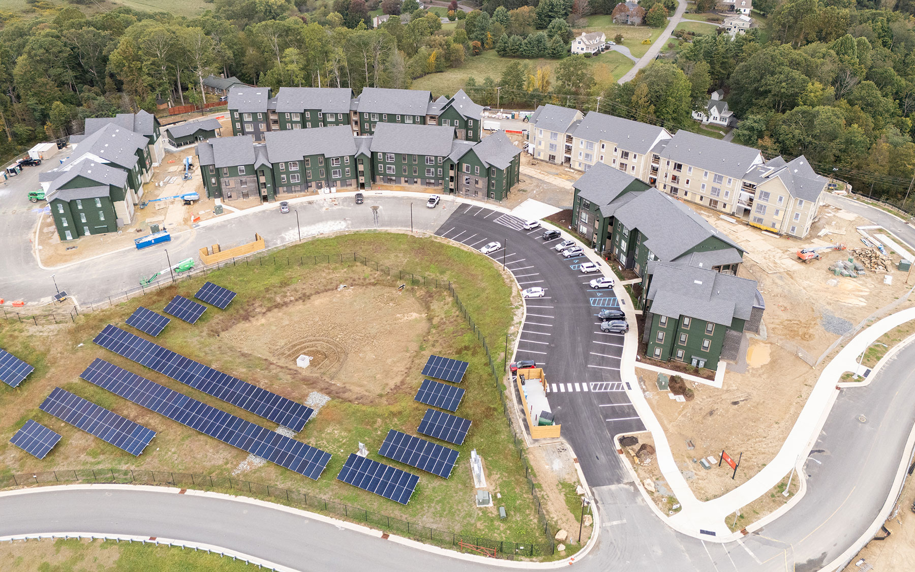 This aerial photo, taken June 11, 2025, shows the faculty and staff housing (far right) under construction as part of Phase 1 development at App State’s Innovation District, as well as the ground-mounted solar photovoltaic panels that have been installed adjacent to the housing facilities, as part of the district’s energy system. Two of the faculty/staff housing facilities are slated for occupancy in fall 2025. Photo by Wes Craig and Kyla Willoughby