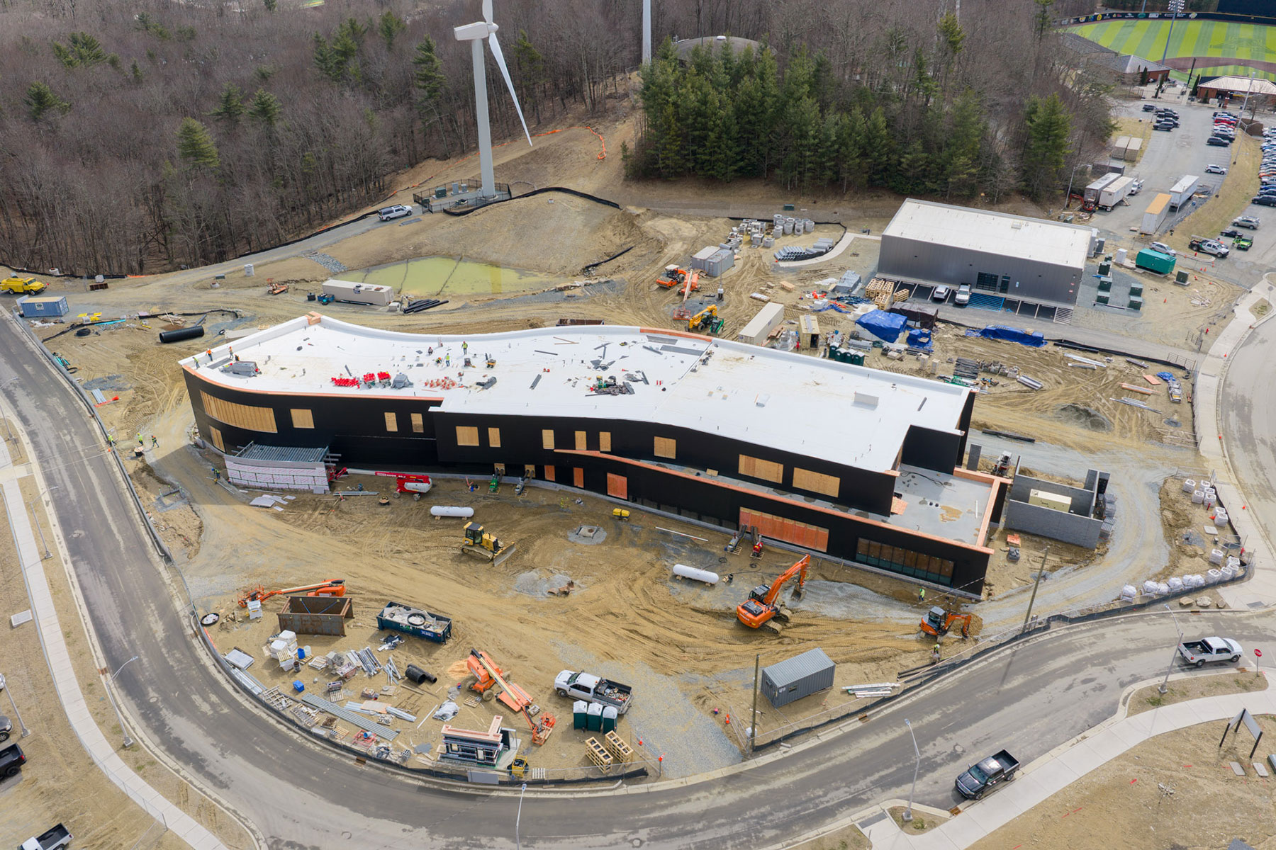 Workers have installed an underground geothermal heating and cooling system, along with two new wind turbines and ground-mounted solar photovoltaic panels, as part of the district’s energy system. These initial system components became fully operational in summer 2025.