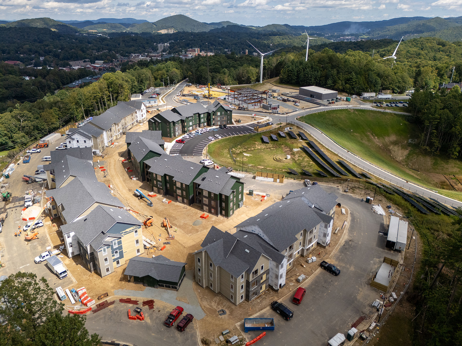 This aerial photo, taken June 11, 2025, shows the faculty and staff housing (far right) under construction as part of Phase 1 development at App State’s Innovation District, as well as the ground-mounted solar photovoltaic panels that have been installed adjacent to the housing facilities, as part of the district’s energy system. Two of the faculty/staff housing facilities are slated for occupancy in fall 2025. Photo by Wes Craig and Kyla Willoughby