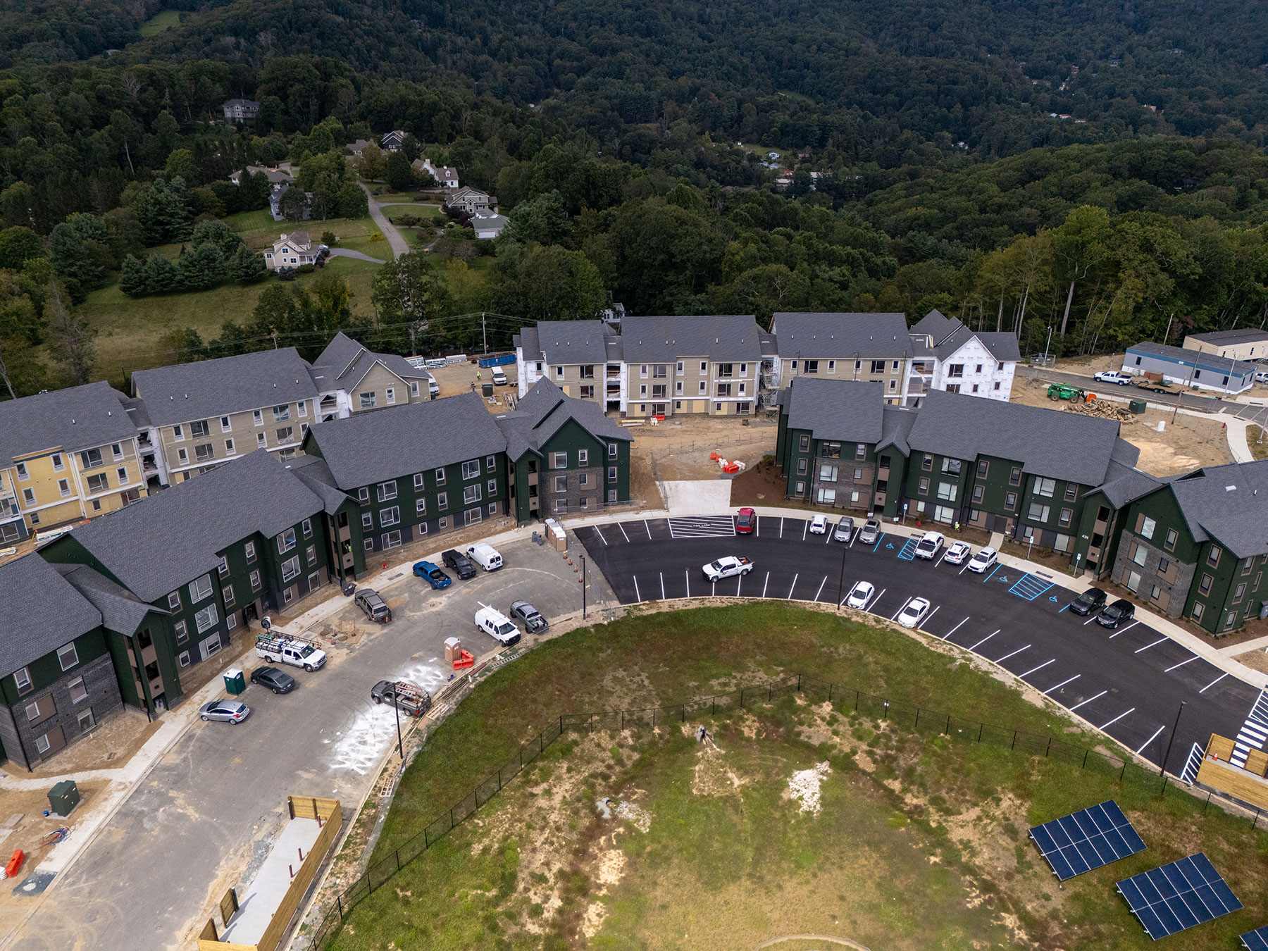 This aerial image, taken Sept. 2, 2025, shows the Innovation Ridge faculty and staff housing project at App State’s Innovation District. The first Innovation Ridge building, shown at right in the foreground, opened to residents on Aug. 16, 2025, and construction is nearing completion for the second Innovation Ridge building, shown at left in the foreground. Innovation Ridge, once completed, will consist of five multistory buildings housing 156 faculty and staff units that offer one-, two- and three-bedroom configurations. Photo by Wes Craig and Troy Tuttle