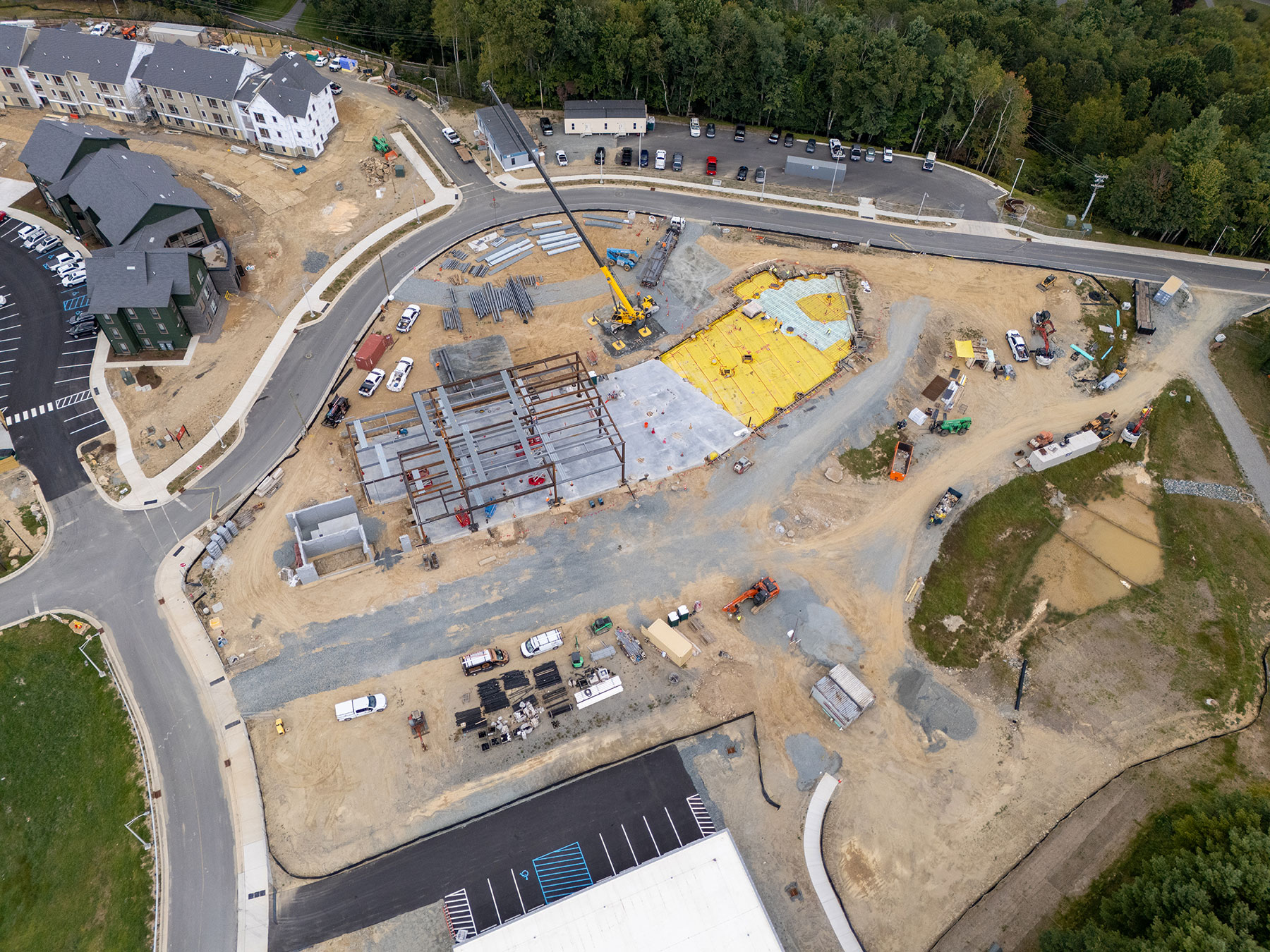 Phase 1 construction progress at App State's Innovation District is shown in this aerial photo, taken May 16, 2024. The steel structural frame for the district's energy system control building is visible at right. Photo by Wes Craig and Chase Reynolds