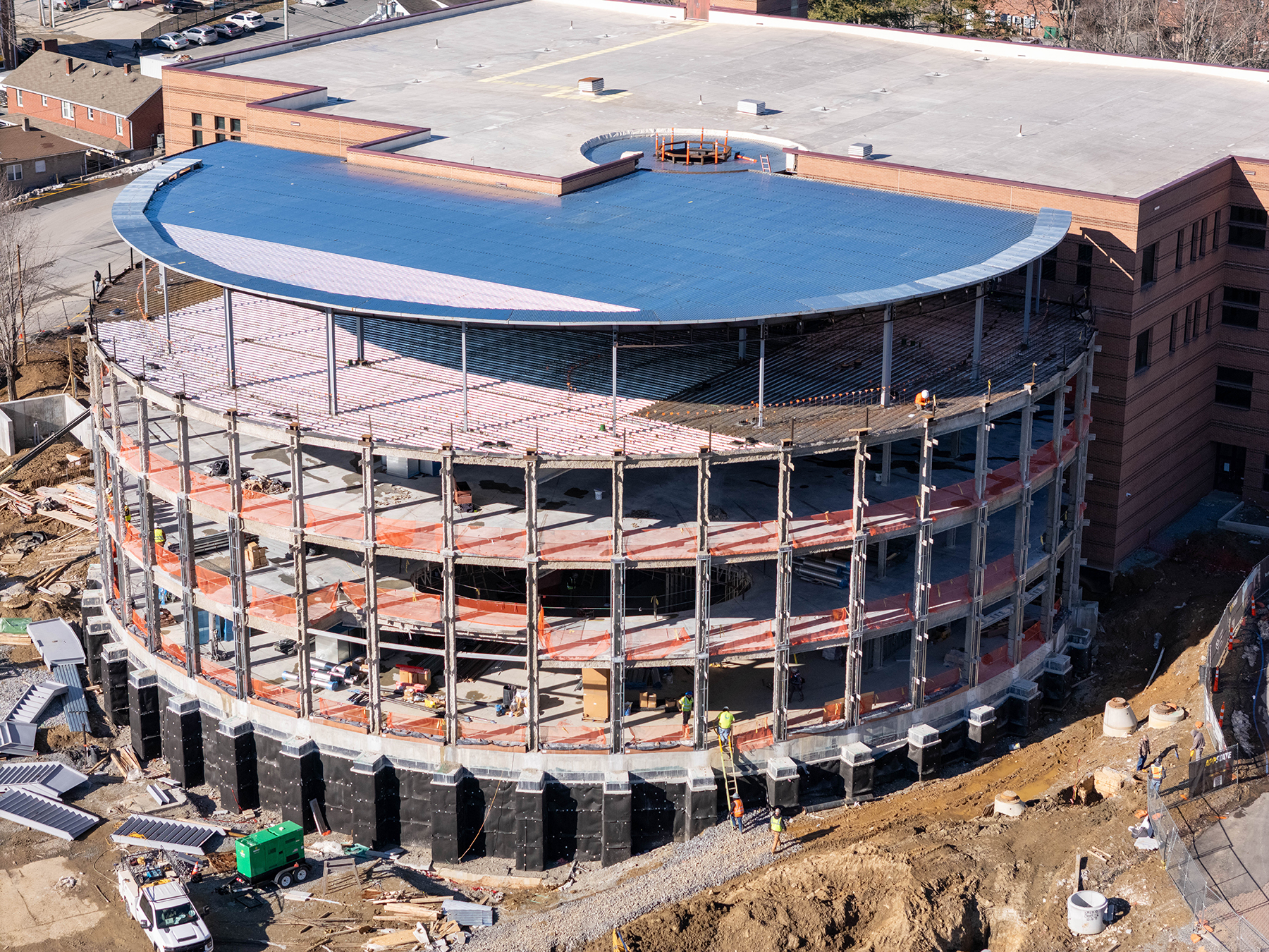 Recent and ongoing construction work for the addition project includes interior framing for the first floor, as well as framing for first-floor exterior columns. Additionally, mechanical, plumbing and electrical crews are continuing the rough-in phase for the facility’s basement and first floor, installing overhead ductwork, piping and conduit.