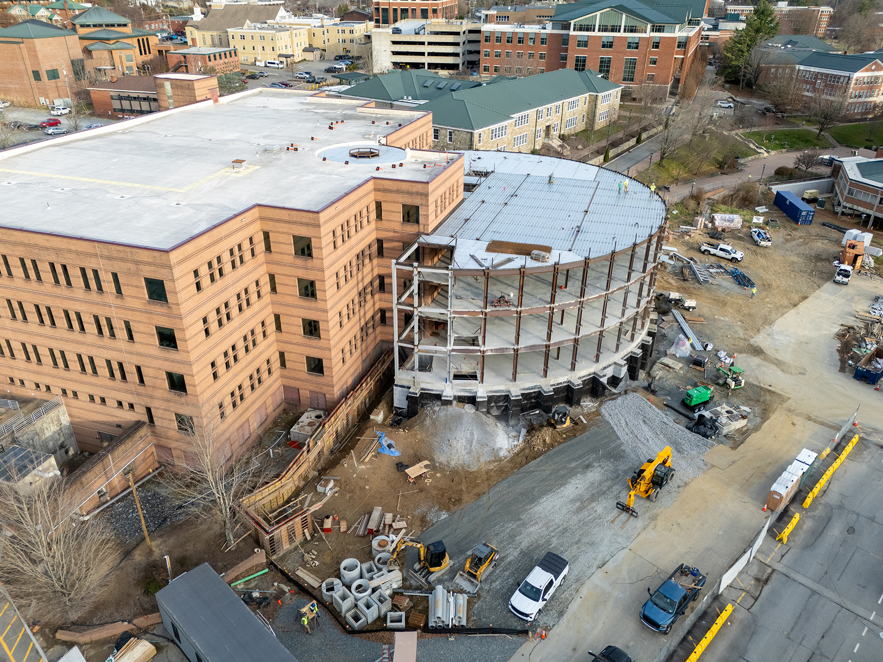 Recent construction work for the addition project includes installing structural steel framing and decking for the facility, which is ongoing. Steel for the facility’s fourth floor is being delivered, and workers are scheduled to begin installing the fourth-floor steel in December 2025. Additionally, the application of waterproofing membranes continues, as does plumbing, mechanical and electrical work on the upper floors. Workers are also preparing to install a northwest retaining wall and pour the third-floor slab.